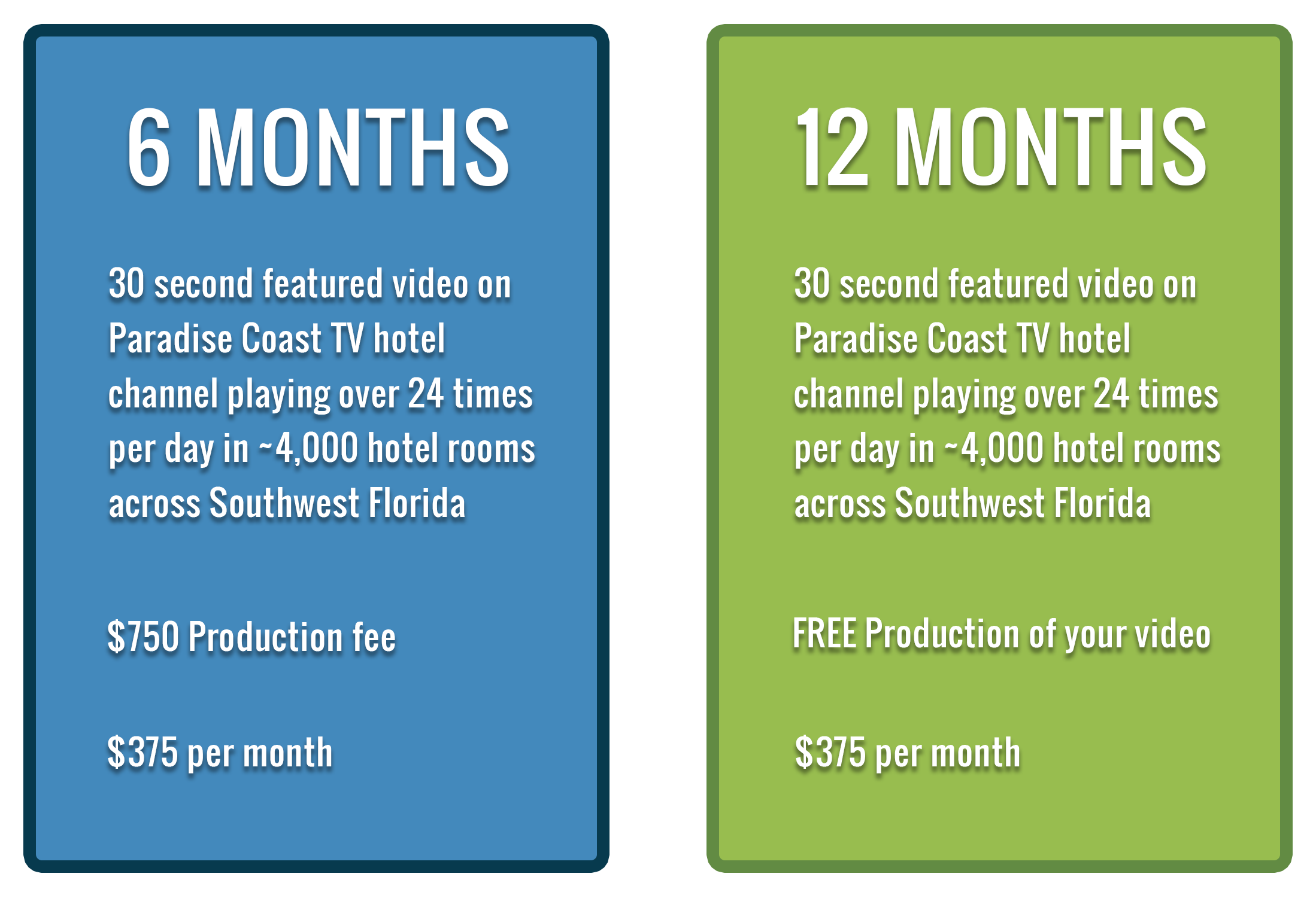 Paradise Coast TV is the visitor channel seen in ~4,000 hotel rooms from Marco Island to Bonita Springs. Our program plays on a one hour loop 24/7 and delivers interesting and useful information to our area's visitors about Where to GO, What to DO, and Where to DINE in Southwest Florida.